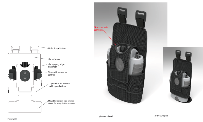 We will produce a series of concepts each of which will comply to the various product requirements. These concepts will be presented as illustrations defining the overall product aesthetic and functionality. Accompanying each concept we will have a Urethane foam model affording us the ability to fully experience each submission. Since this is a body worn object as well as a handheld each concept needs to be considered 3 dimensionally.